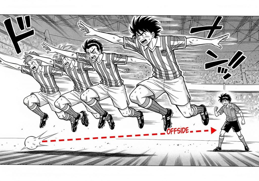 リコ:ディフェンスラインを高く保ち、相手をオフサイドの位置に誘い込むテクニックだよ。チームの息が合わないと成功しない、難しいけど決まると可愛いですねーな戦術だ!